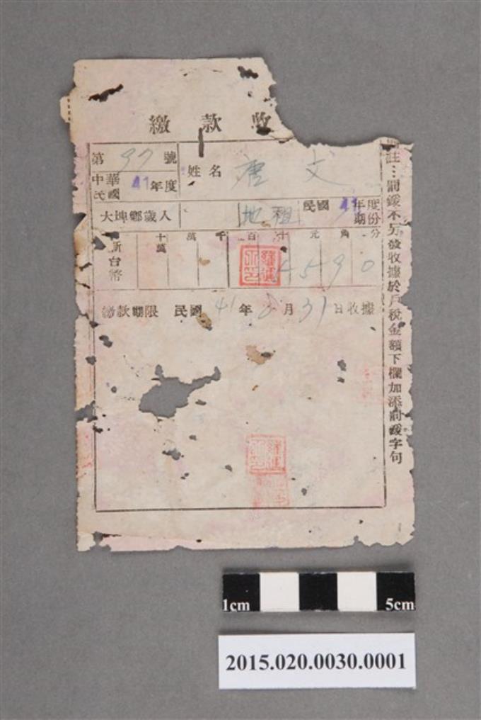 大埤鄉公所給唐文民國41年度第2期份地租繳款收據