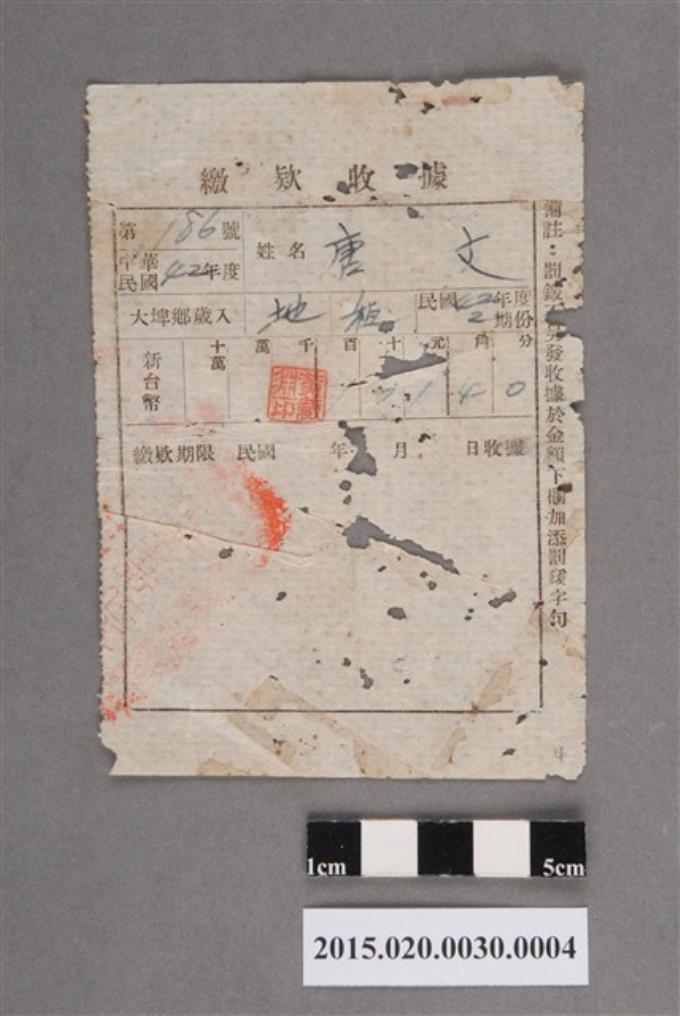 大埤鄉公所給唐文地租繳款收據
