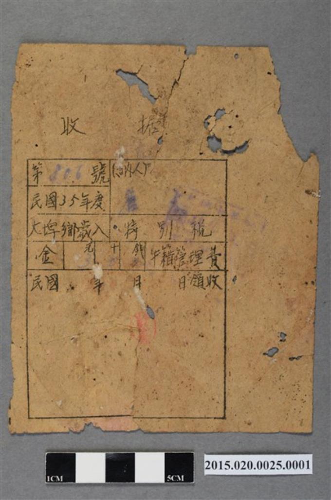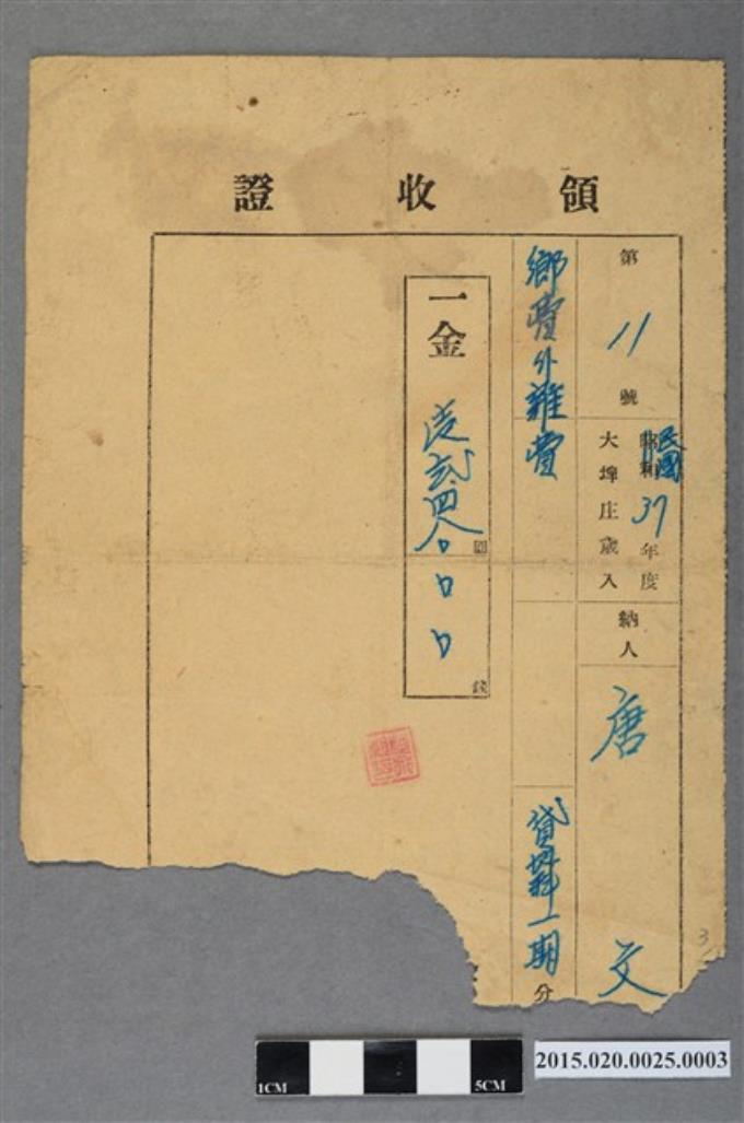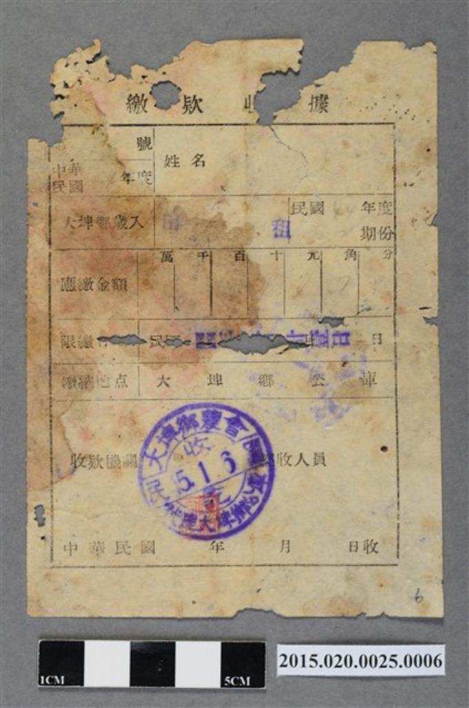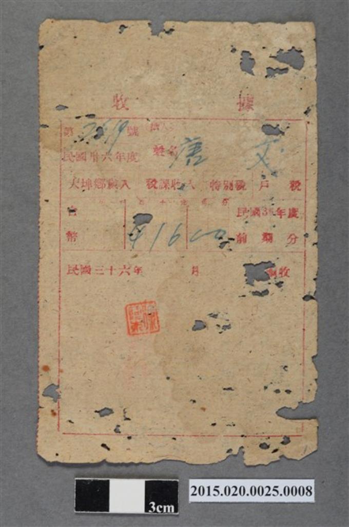 大埤鄉公所給唐文民國41年2期份戶稅繳納收據