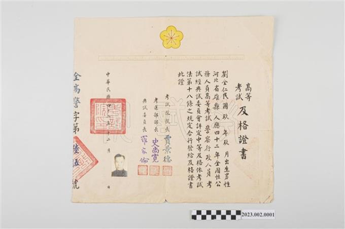 中華民國四十二年十二月劉全仁高等考試及格證書