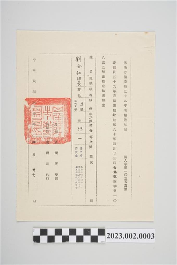 民國60年4月27日劉全仁基隆市警察局五十九年考績通知書