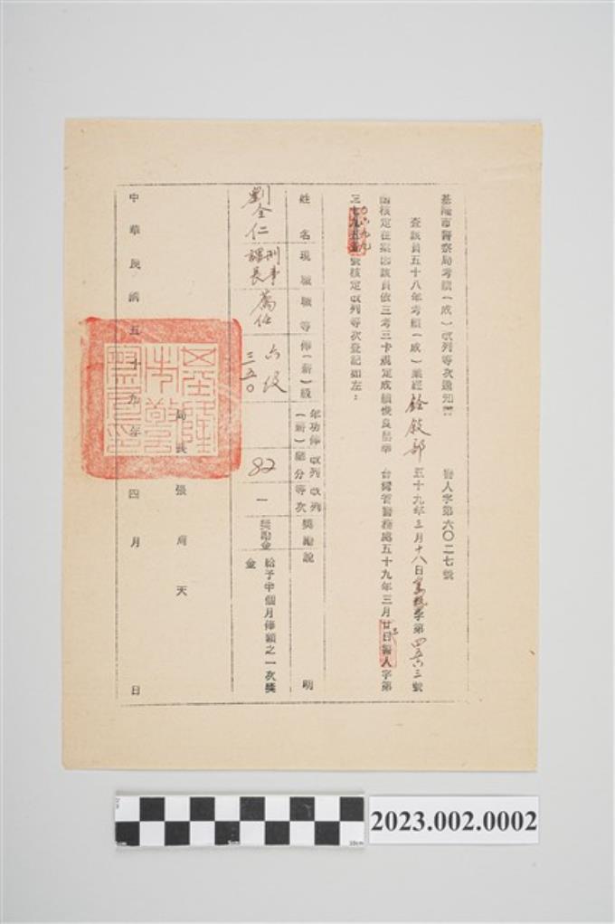 民國59年4月劉全仁基隆市警察局考績(成)改列等次通知書
