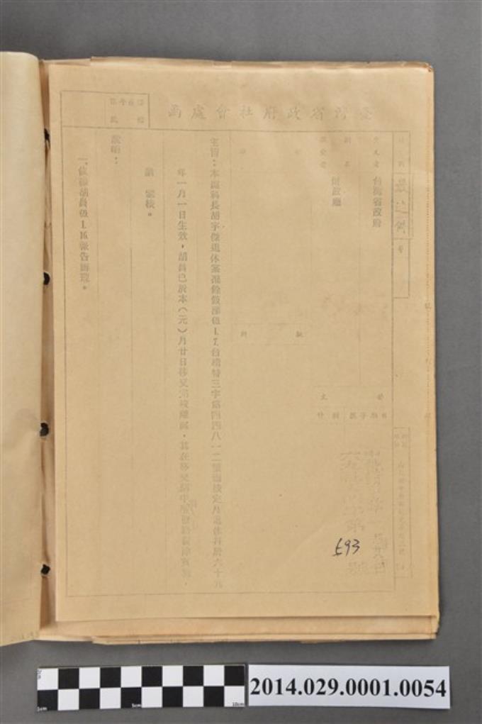 胡宇傑臺灣省政府社會處職員退休函(一)