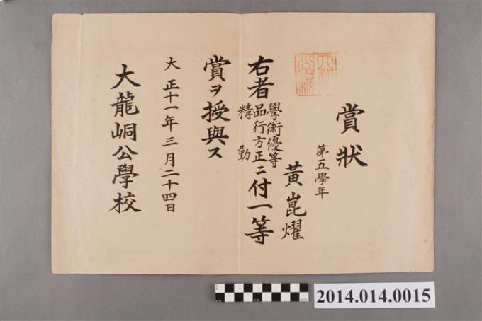 黃崑燿就讀大龍峒公學校五年級一等獎獎狀