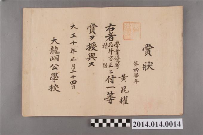 黃崑燿就讀大龍峒公學校三年級一等獎獎狀