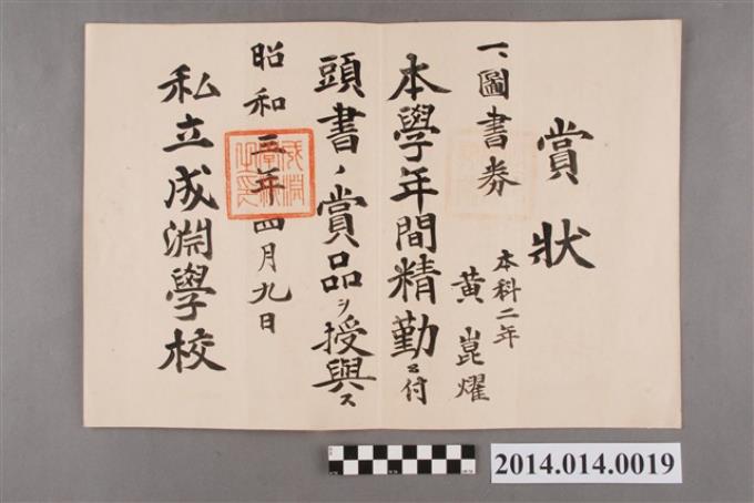 黃崑燿就讀成淵學校本科二年級學年成績第一名獎狀