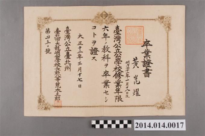 黃崑燿大龍峒公學校畢業證書