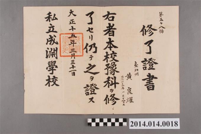 黃崑燿成淵學校預科畢業證書