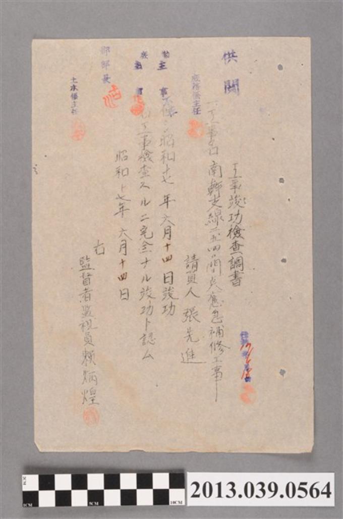 嘉南大圳組合〈新化郡部監視員提交之南幹支線工程完工報告書〉