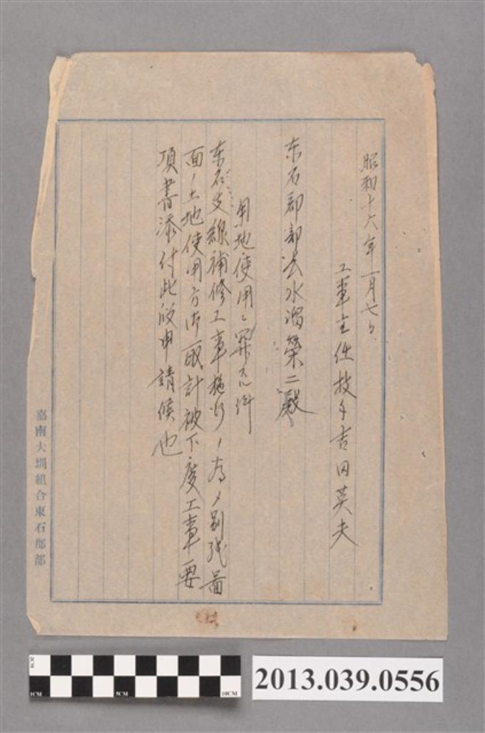 嘉南大圳組合〈工程主任提交東石郡部關於東石支線補修工程土地使用方法公文〉