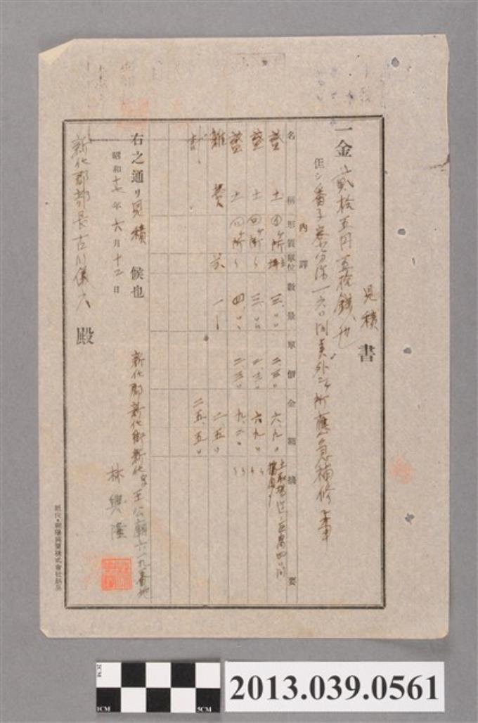 嘉南大圳組合〈林乞食發給新化郡部關於番子寮分線工程之報價單〉