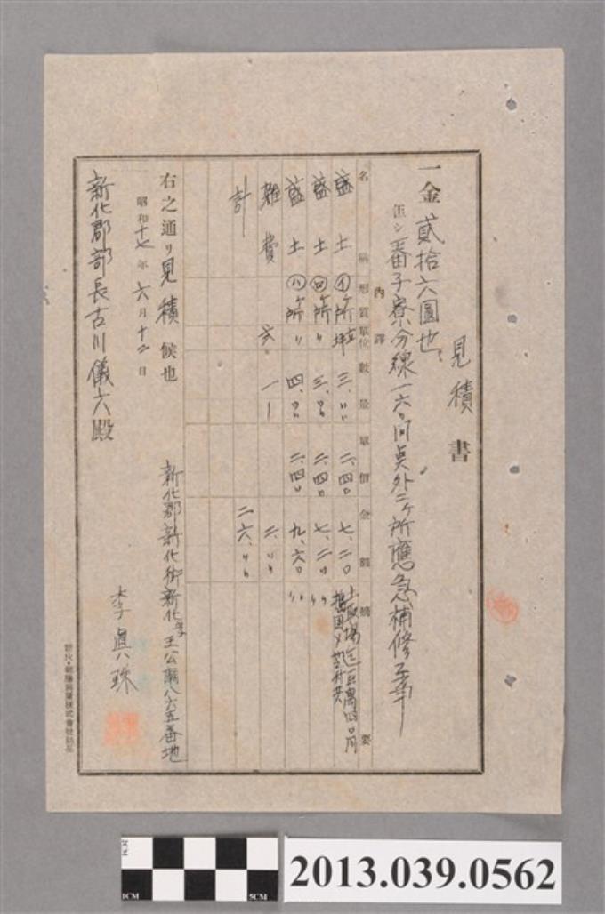 嘉南大圳組合〈李真珠發給新化郡部工程報價單〉