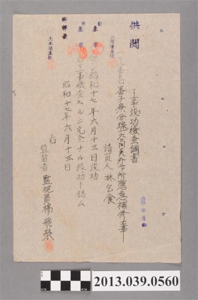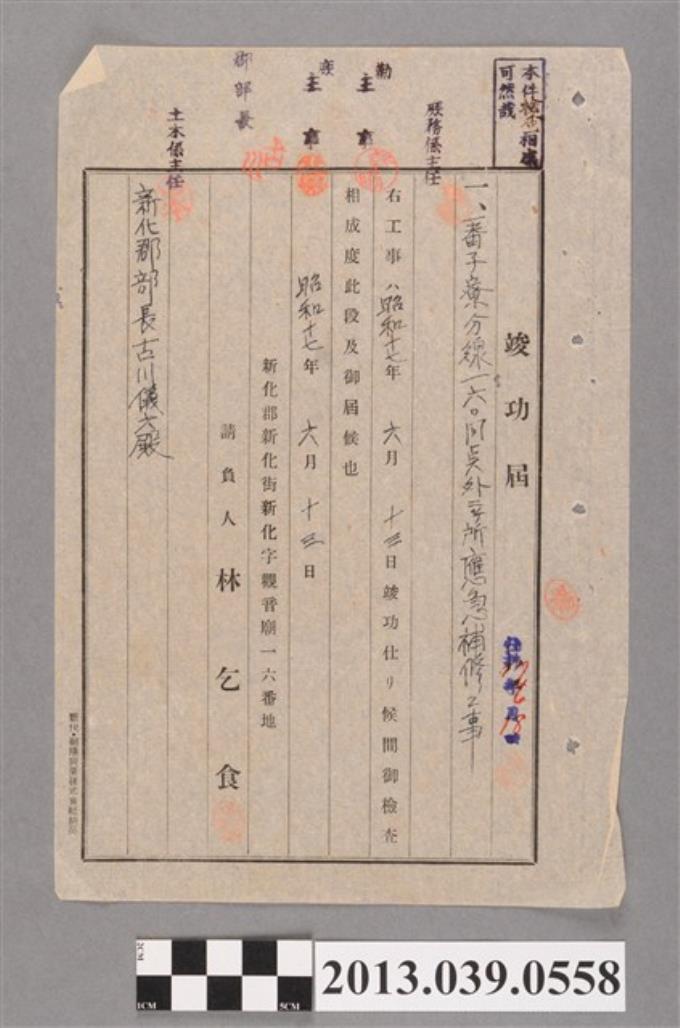 嘉南大圳組合〈林乞食發給新化郡部關於番子寮分線工程之完工申報書〉
