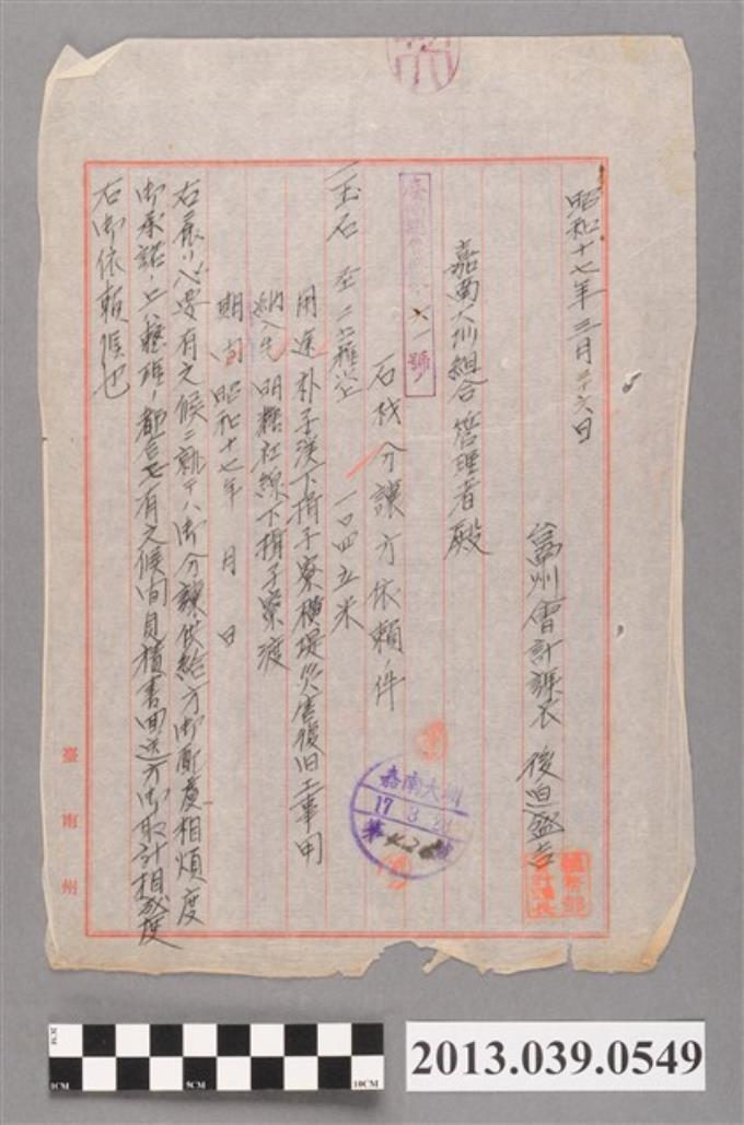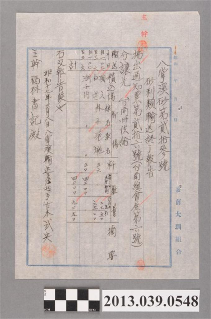 嘉南大圳組合〈臺南州會計課發文臺南大圳組合管理者關於工程估價單事宜函〉