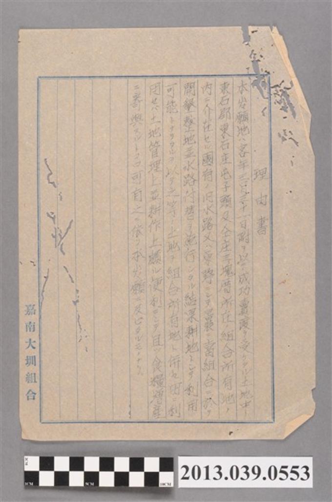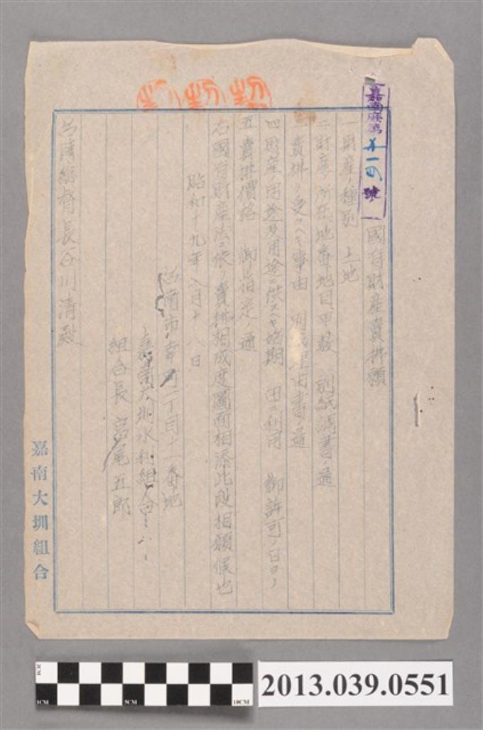 嘉南大圳水利組合發給臺灣總督關於請購國有財產土地之公文稿