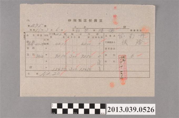 嘉南大圳組合〈砂利類送付傳票 第295號〉