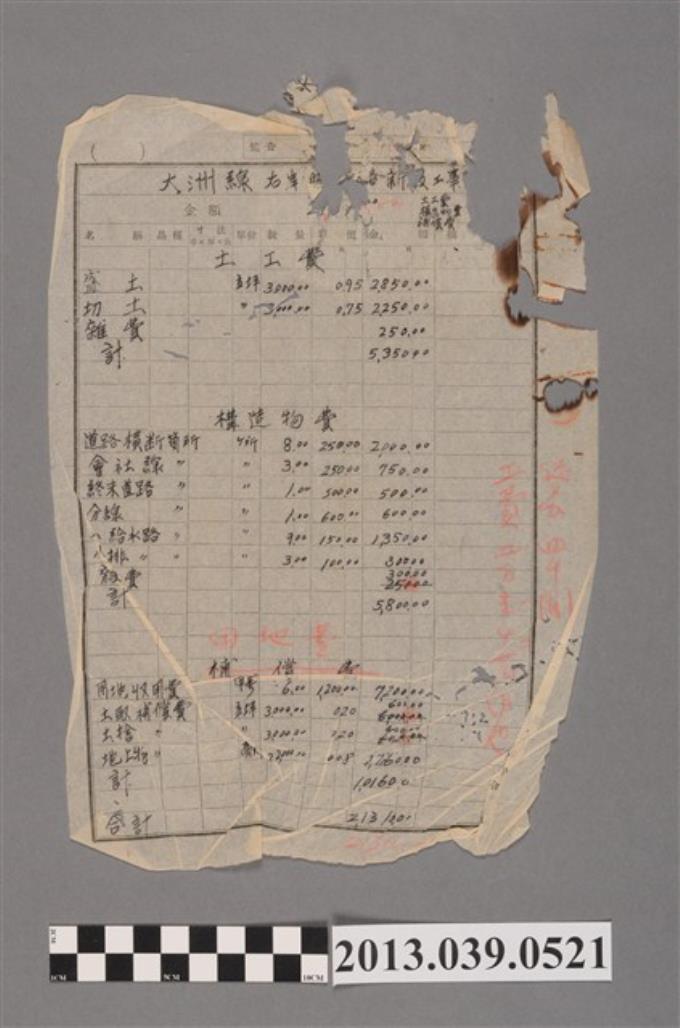 嘉南大圳組合〈大洲線右岸新設工程估價明細〉