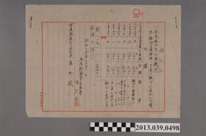 嘉南大圳組合〈虎尾郡崙背庄麥寮楊恩宛向東麥寮實行小組合長之勞務請款申請書〉