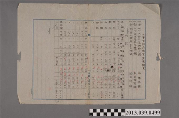 嘉南大圳組合東石郡部〈工程材料豫算變更請單〉