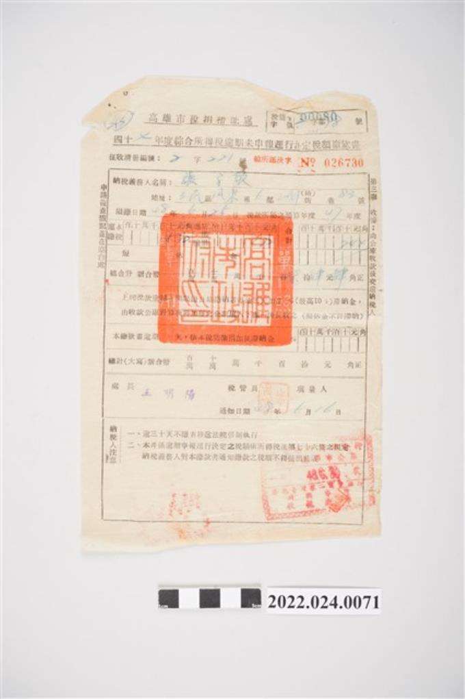張子敬臺灣省高雄市稅捐稽征處所得稅查定通知書