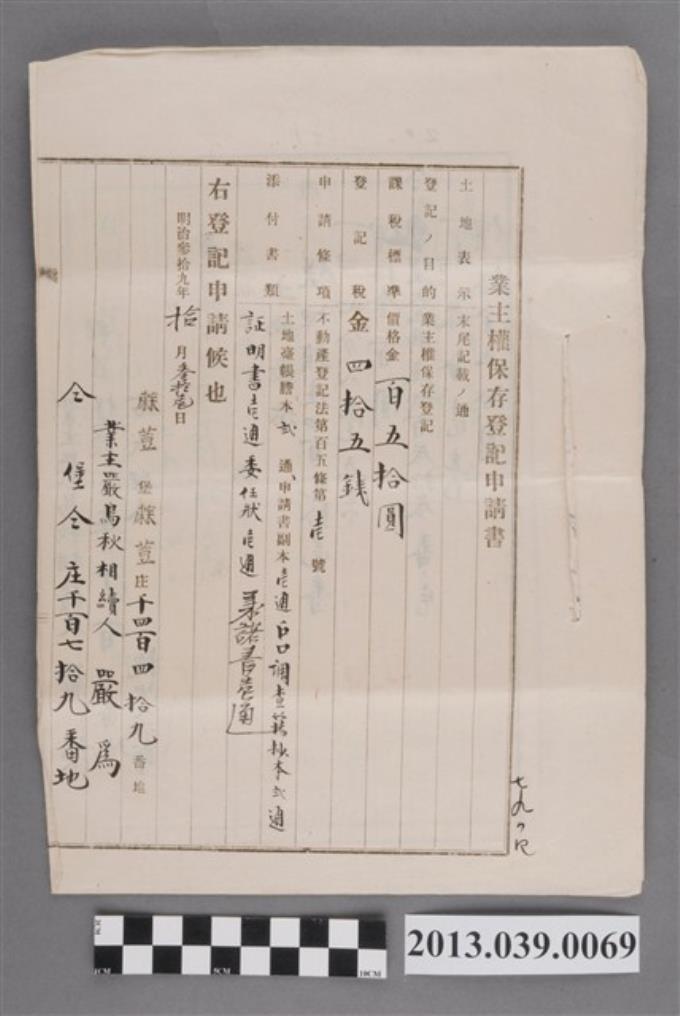 蔴荳堡蔴荳庄業主嚴鳥秋之業主權保存登記申請書