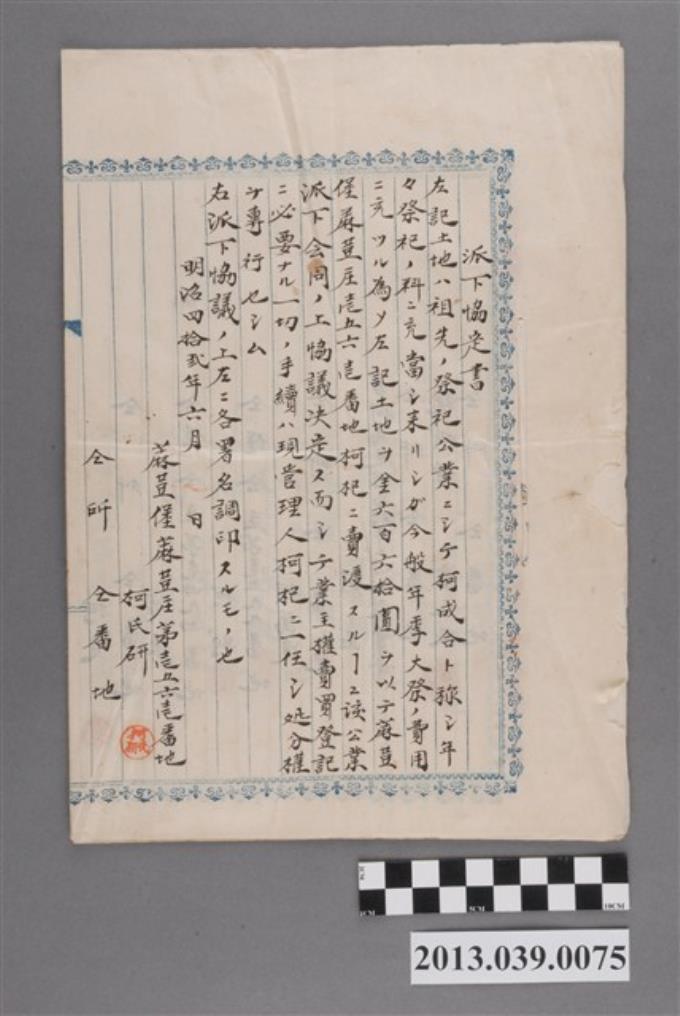 蔴荳堡蔴荳庄給柯氏研、柯受、柯榮等人派下協定書