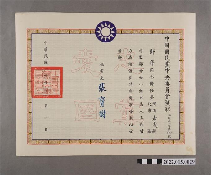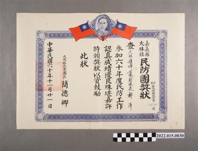 民國60年鄭萍嘉義縣大林鎮民防團獎狀