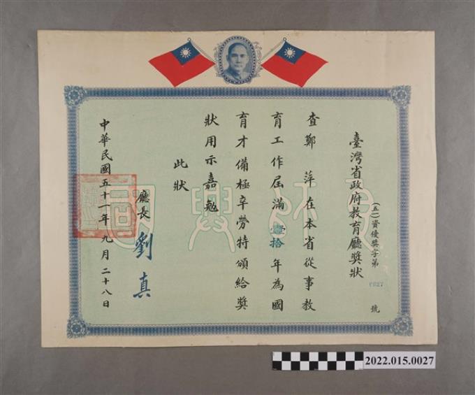 民國51年鄭萍臺灣省政府教育廳獎狀