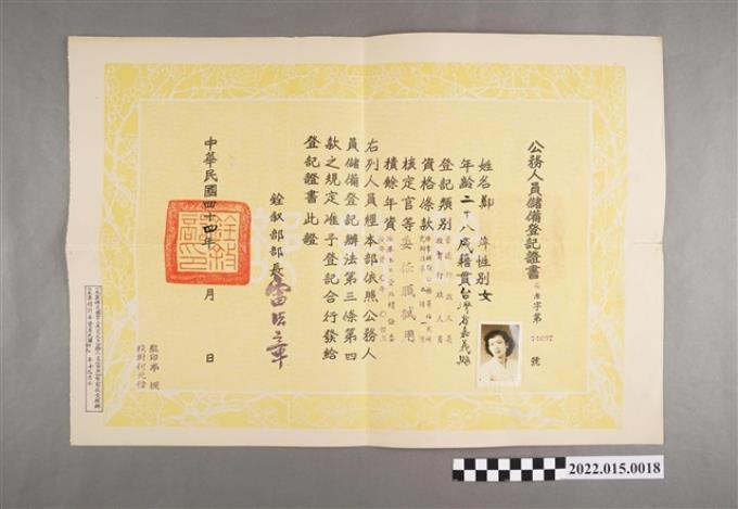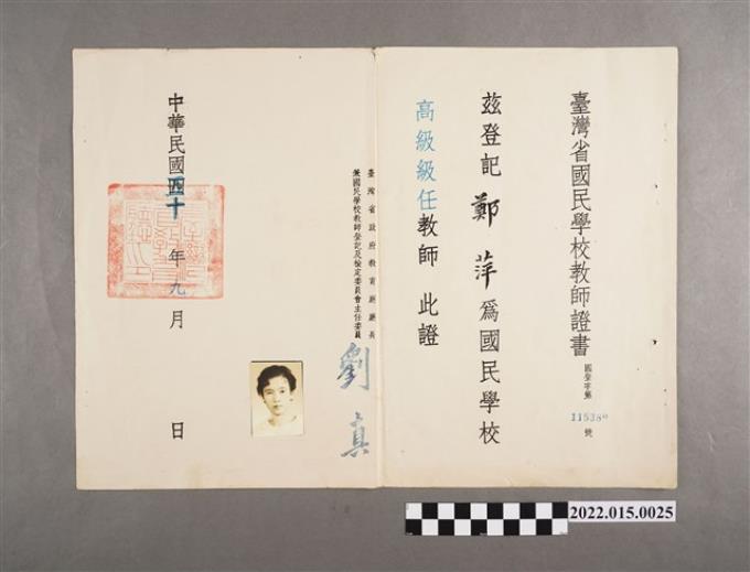 民國43年鄭萍臺灣省臺南區國民學校教員暑期講習班結業證書