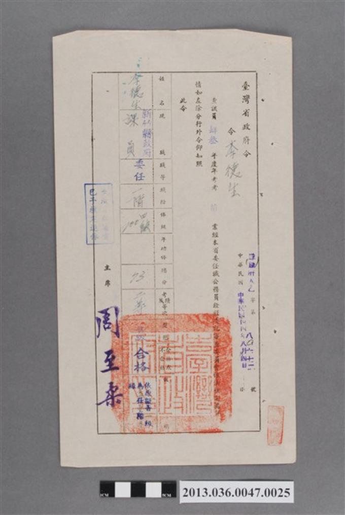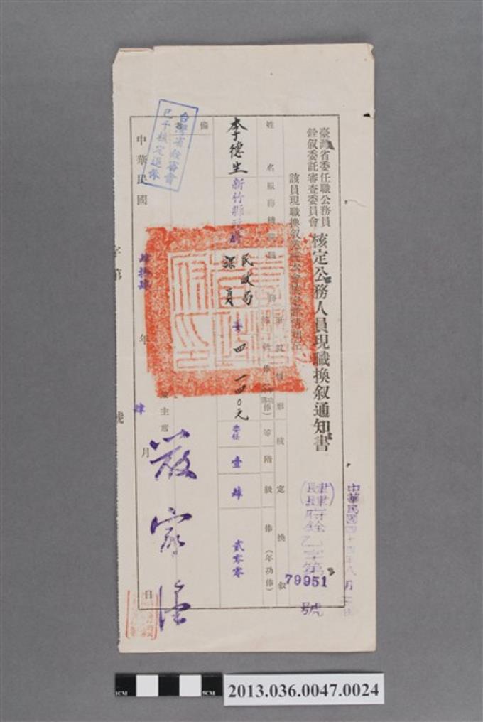 臺灣省委任職公務員銓敘委託審查委員會核定公務人員現職換敘通知書