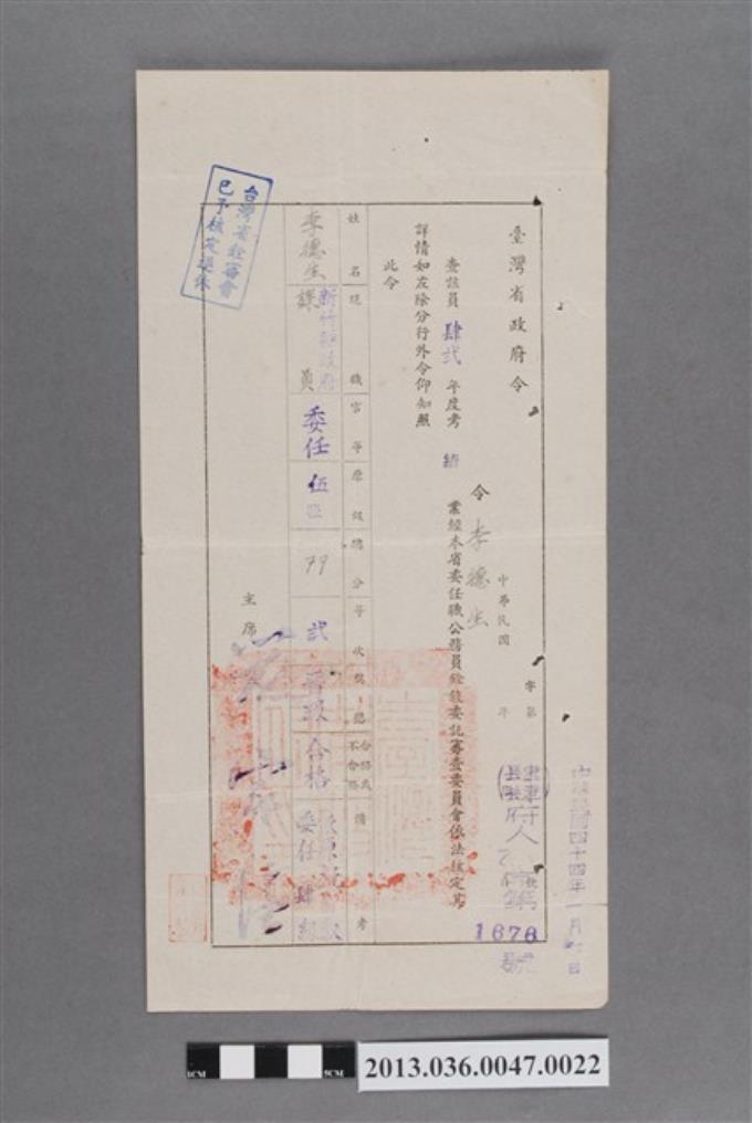 新竹縣政府44年度年考考績通知書