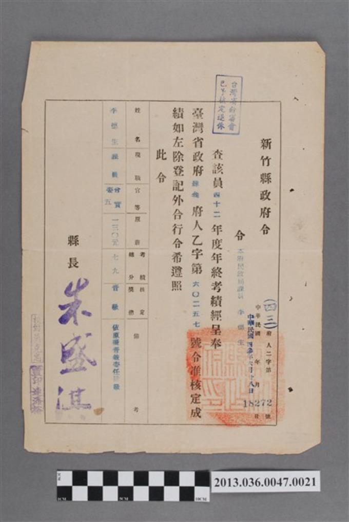 新竹縣政府43年度年考考績通知書