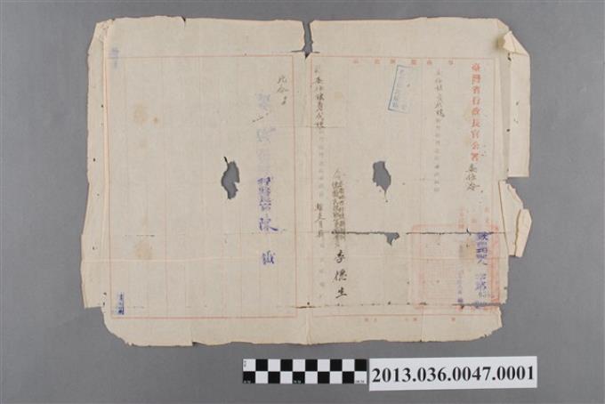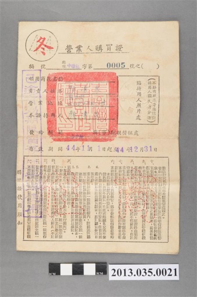 臺中縣稅徵稽徵處發給顏湧泉營業人購買證及繳回收據