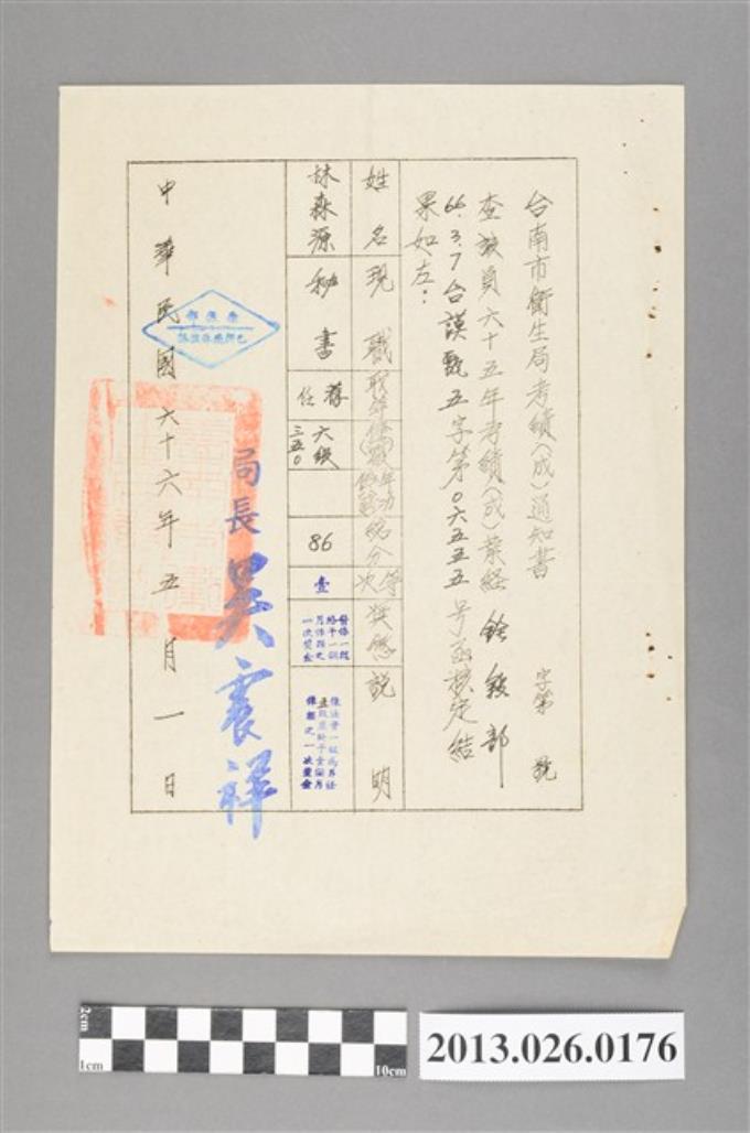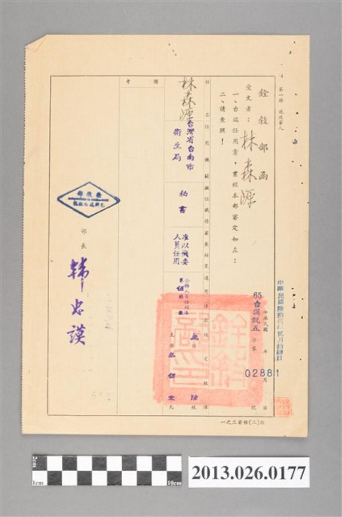1976年2月24日銓敘部核准林森源任用台南市衛生局秘書函