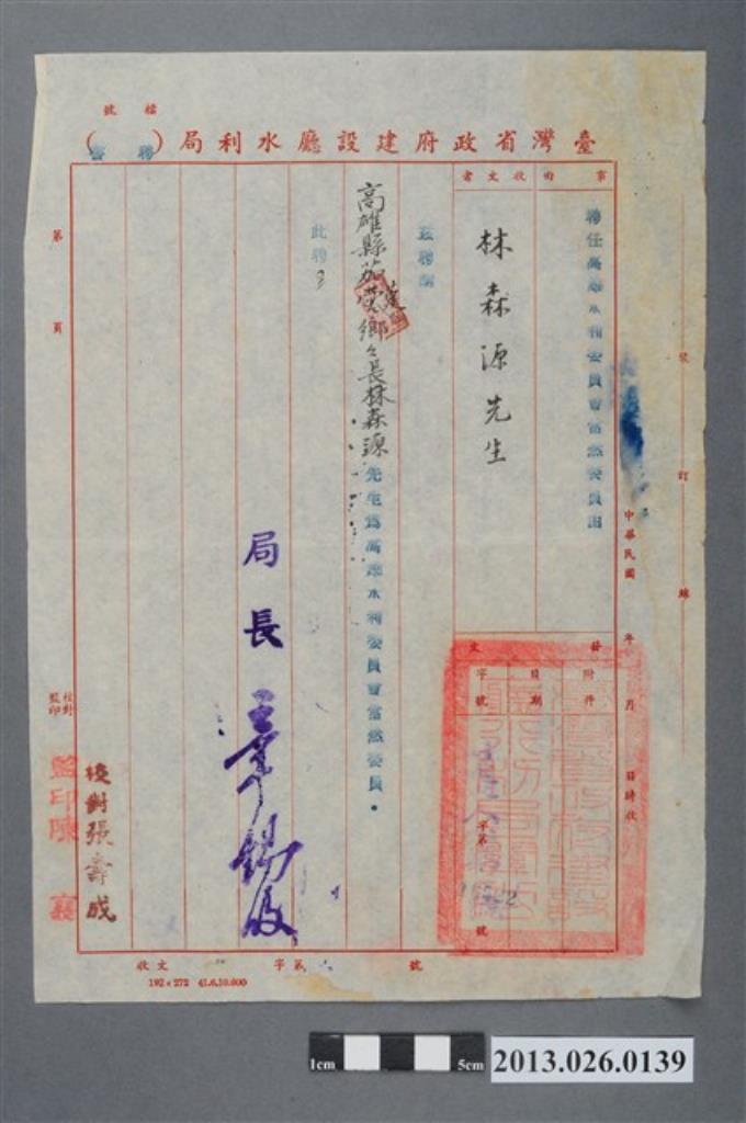 臺灣省建設廳水利局聘林森源為高雄水利委員會當然委員之聘書