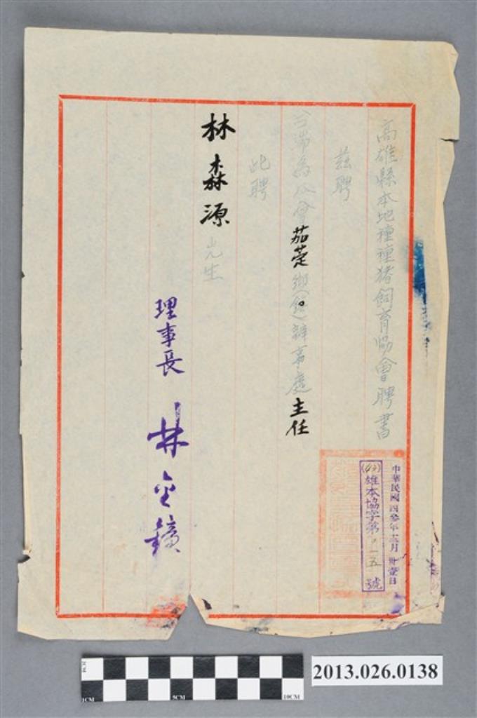 1954年12月31日林森源先生受聘為高雄縣本地種種豬飼育協會茄萣鄉辦事處主任聘書