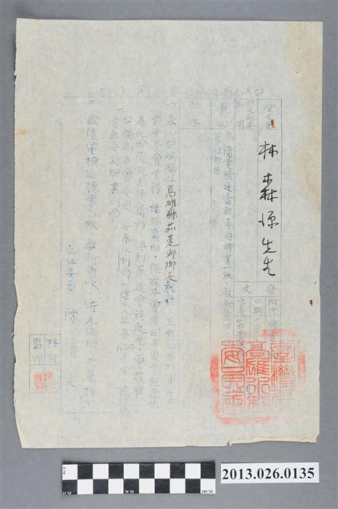 1955年1月高雄縣縣長聘林森源先生為茄萣鄉衛生委員會委員之聘書