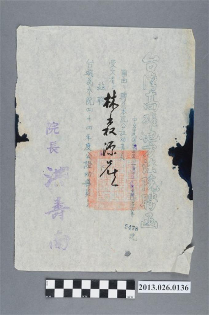 1955年3月林森源先生受聘為台灣高雄地方法院公證勸導員