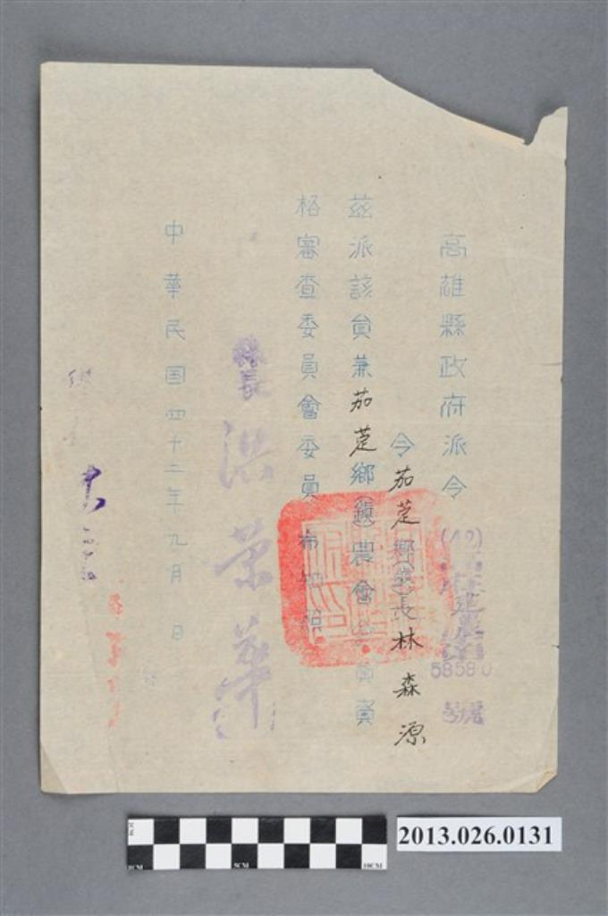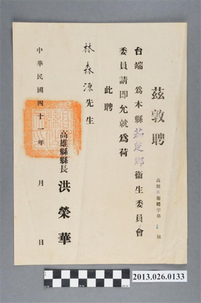 1952年高雄縣縣長聘林森源先生為茄萣鄉衛生委員會委員聘書