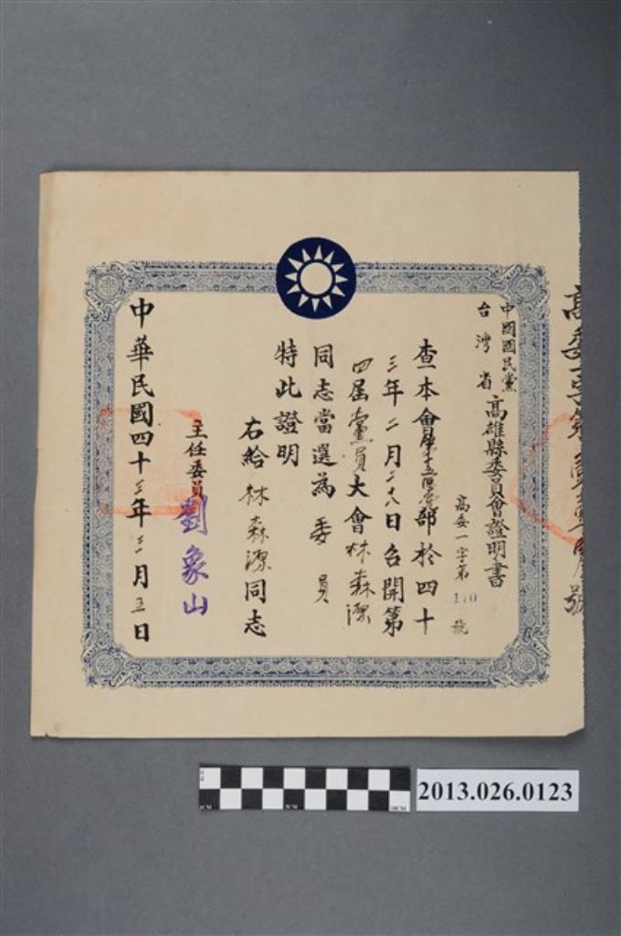 1954年3月5日林森源先生當選為中國國民黨台灣省高雄縣委員會第十五區黨部委員證明書