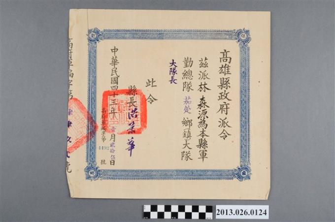 1954年1月25日高雄縣政府派林森源擔任為本縣軍勤總隊茄萣鄉大隊大隊長派令