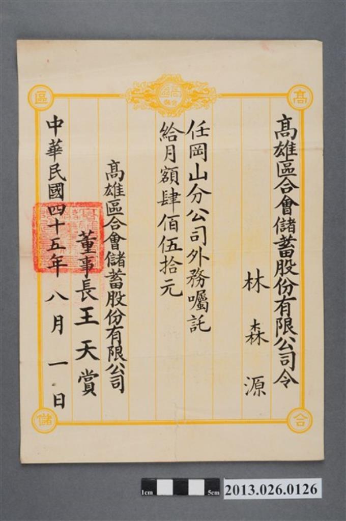 1956年8月1日林森源任高雄區合會儲蓄股份有限公司令