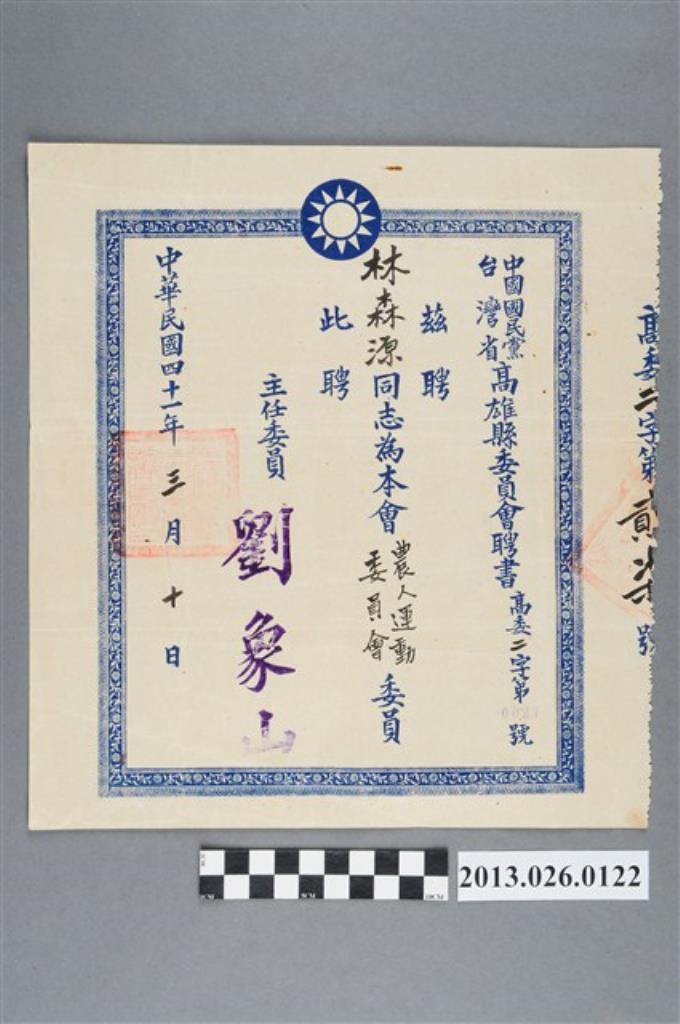 1952年3月10日中國國民黨高雄縣委員會頒發林森源為農人運動委員會委員聘書