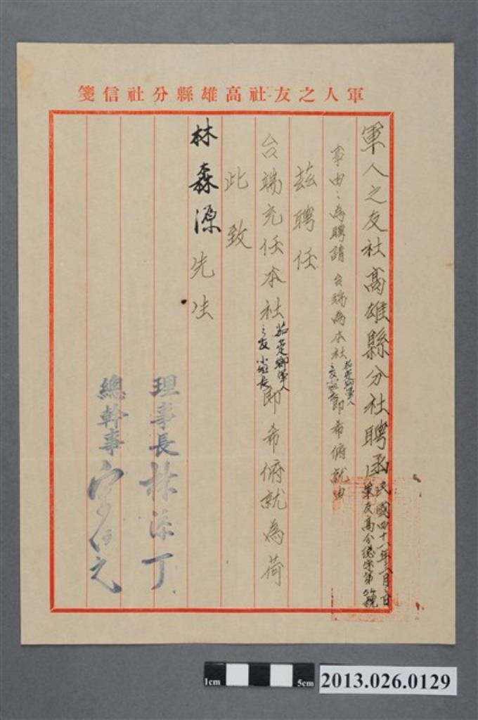 1952年3月3日林森源先生任茄萣鄉軍人之友小組長聘函