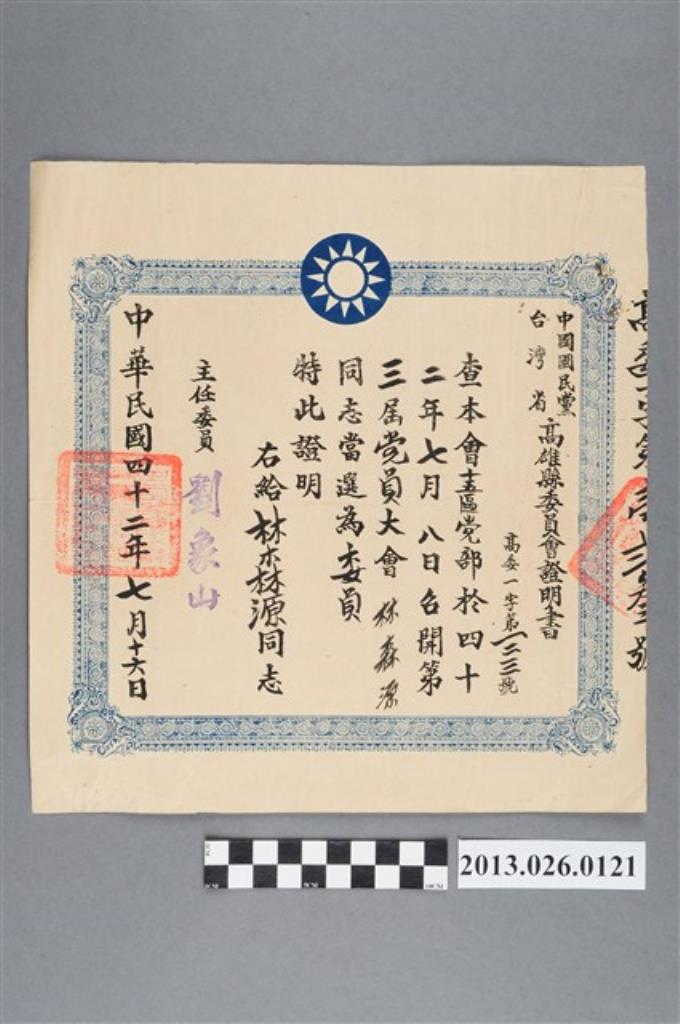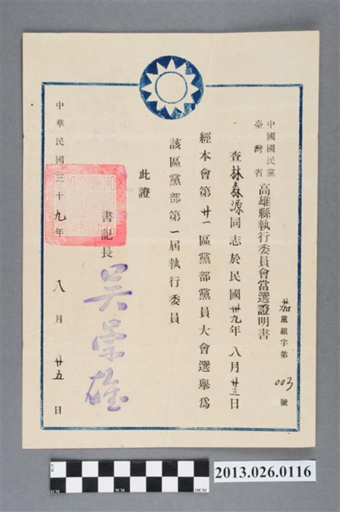 1953年7月16日林森源先生當選中國國民黨台灣省高雄縣委員會十五區黨部委員證明書