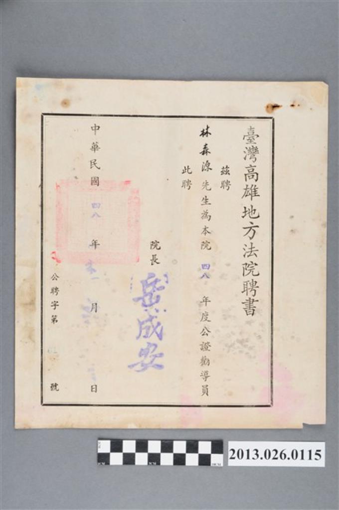 1959年1月高雄地方法院聘林森源先生為四八年度公證勸導員聘書