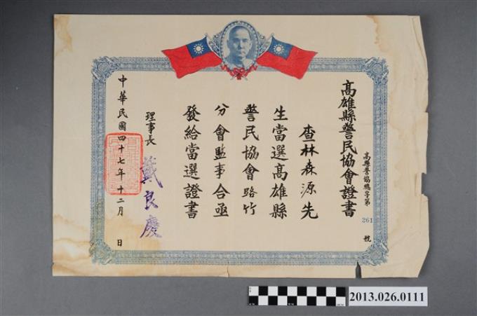 1958年12月林森源先生當選高雄縣警民協會路竹分會監事證書