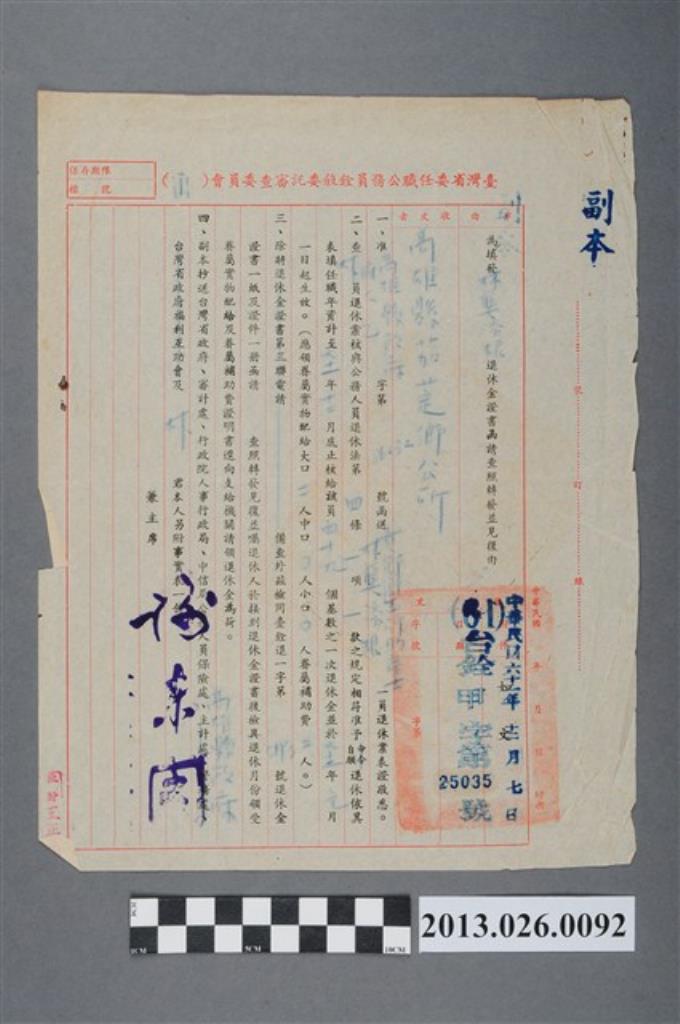 1972年12月7日台灣省委任職公務員銓敘委託審查委員會為填發林龔添根退休金證書等公文
