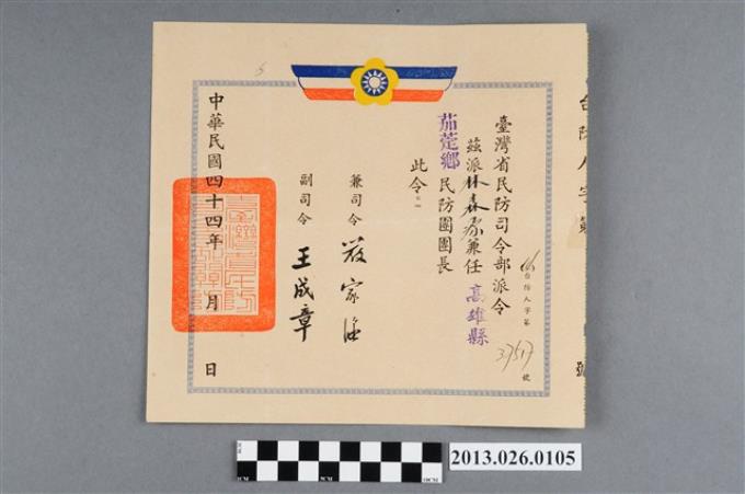 1955年台灣省民防司令部派林森源兼任高雄縣茄萣鄉民防團團長派令