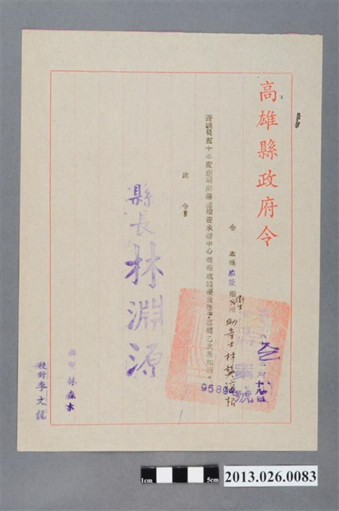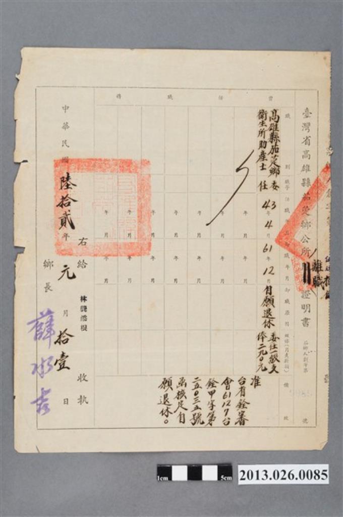 1973年3月9日高雄縣政府令茄萣鄉衛生所助產士林龔添根自願退休開缺